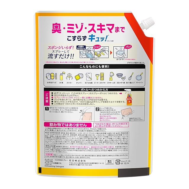 商品名:キュキュット 【大容量】デカラクサイズ CLEAR泡スプレー 食器用洗剤 奥・ミゾ・スキマまでこすらず洗浄! オレンジの香り つめかえ用 1250ml 【.co.jp限定】