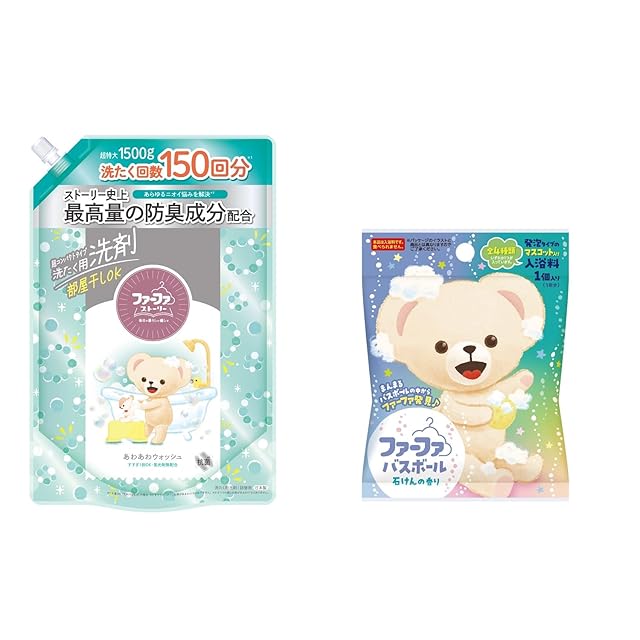 商品名:ファーファ ストーリー 洗濯洗剤 あわあわウォッシュ 詰替用 特大 1500g パウダリームスクの香り(微香性) +バスボール 75g せっけんの香り マスコット入り