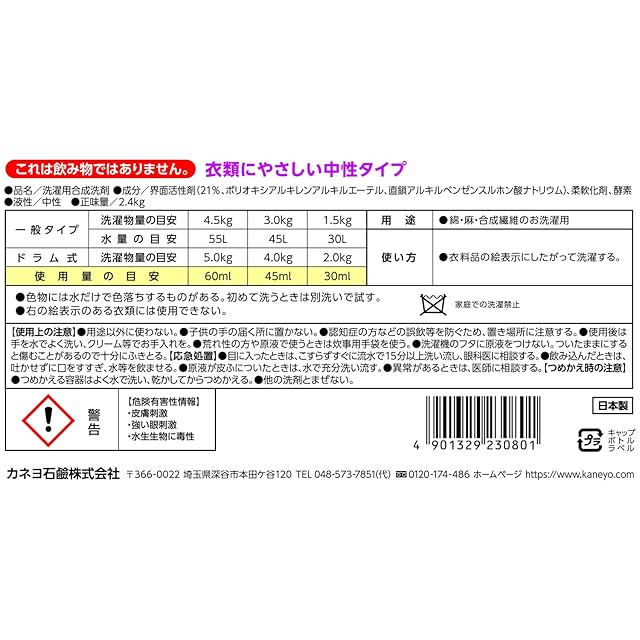 商品名:カネヨ石鹸 【大容量】柔軟剤入り衣料用洗剤 2.4KG 本体ボトル 中性タイプ 縦型・ドラム式対応 日本製