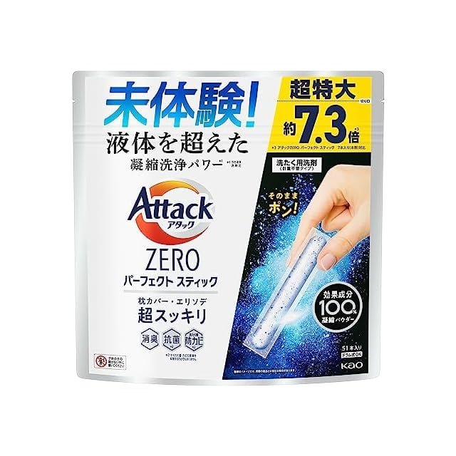 商品名:【大容量】 アタックZERO パーフェクトスティック 洗濯洗剤 液体を超えた凝縮洗浄パワーでエリソデも超スッキリ スプラッシュグリーンの香り 51本入り