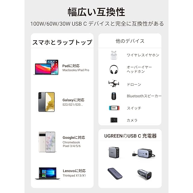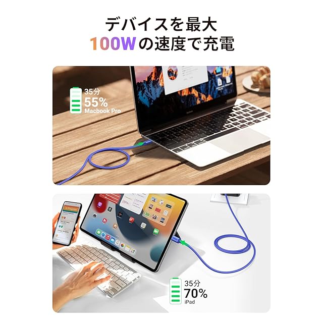 【幅広い互換性】 UGREEN usbc ケーブルはiPhone 16/15、MacBook Pro、Macbook Air、iMac、ChromeBook Pixel 、Dell XPS 、Moniteur 4k、 Galaxy S24、 Mate 20/ Mate 20 Pro/ P20/ P20 Pro/ Mate 10/ P10、HTC U11/ 10など様々なUSB type cデバイスに対応できます。スマホだけでなく必要の充電時間を短縮したい各種のタブレット、ノートパソコンなどの充電時間を大幅に減らせます。