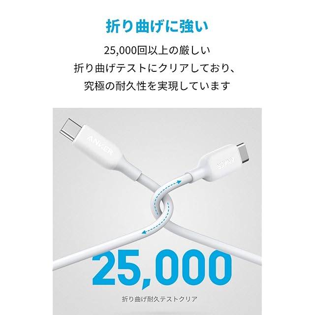 折り曲げに強い:25,000回以上の厳しい折り曲げテストにクリアしており、究極の耐久性を実現しました。また、Anker PowerLine III USB-C & USB-C 2.0 ケーブルは、PowerLineシリーズが持つ高耐久性を残しつつ、シリーズ史上最も細い構造に仕上げました。