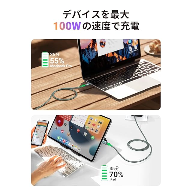 UGREEN USB-CまたはUSB-Cケーブル100Wで高速充電が可能で、時間を節約できます。