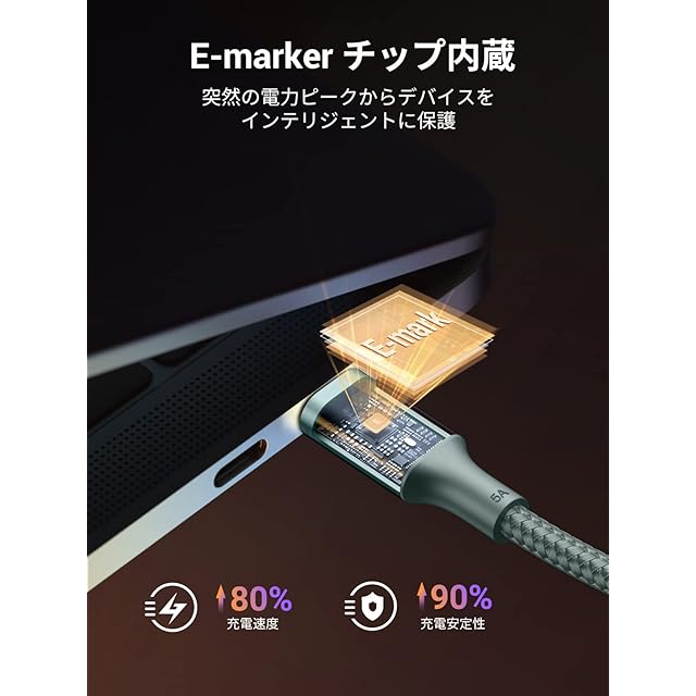 【安全保護】過電流/過熱/短絡保護およびE-markerスマートチップを搭載し多層シールドも内蔵しており、安全で安定した電源を提供します。高速充電とデータ転送に最適な選択で、自宅やオフィスで高速充電を楽しめます。