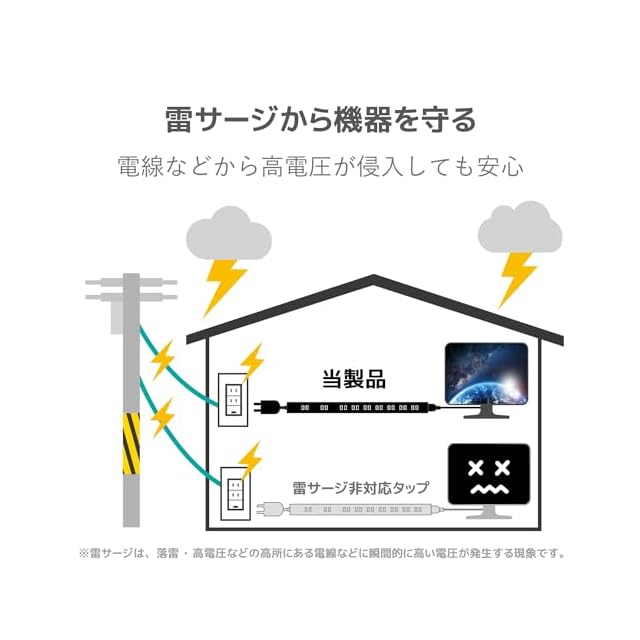 コンセントから進入する12500V(JEC210/212規格に基づく数値)までの誘導雷による雷サージから接続機器を保護する雷ガード機能を搭載しています。※受けた電圧や回数により性能は劣化します。