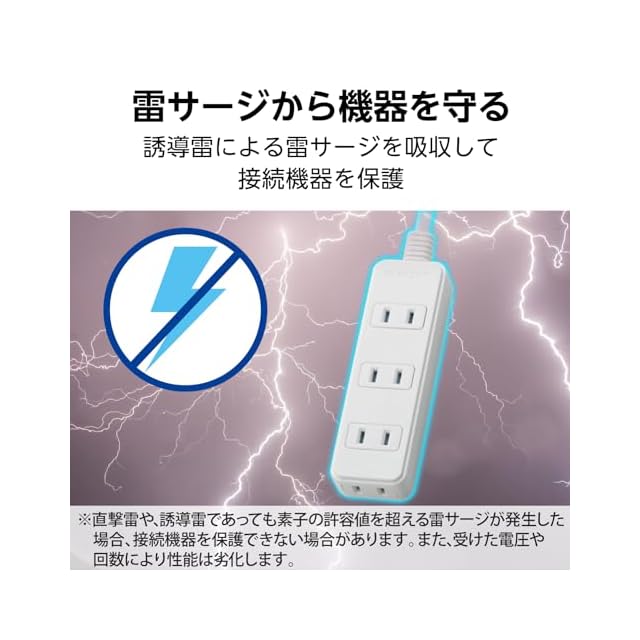 最大サージ電圧12500Vの高性能雷サージ吸収素子(バリスタ)を内蔵していますので、雷によるパソコンやAV機器などの電子機器への被害防止に有効です。 ※最大サージ電圧12500VはJEC210/212規格に基づく数値です。IEC61000-4-5規格では最大サージ電圧は4500Vになります。