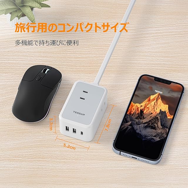 【10M延長コード付き】本体サイズ7.8x5.2x3.7cm。10mの超長コードで、部屋のレイアウトを制限されず自由に配置可能。お部屋のコンセントから離れた場所でも電源を確保して電気機器を使用できます。