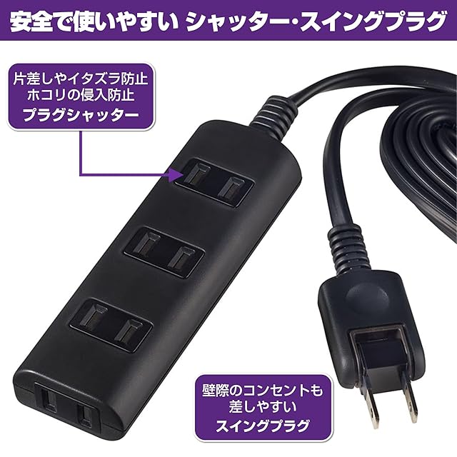 ●180°回転プラグ。耐トラッキングカバー付。 ●熱に強い。 ●使用していないコンセントの刃受口を封じて幼児のいたずらによる感電予防となります。 ●安全の保護被ふく