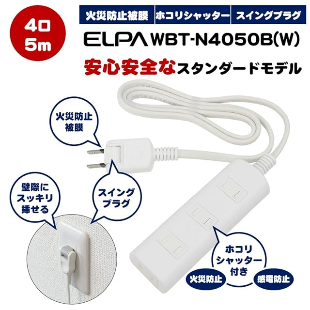 エルパ(ELPA) 扉付タップラン 電源タップ 延長コード 125V 5m 4個口 ホワイト WBT-N4050B(W)