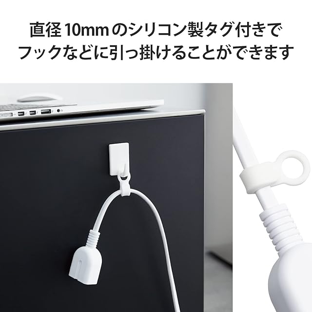 機器のコードがコンセントに届かない場合などに、電源を延長するためのコードです。極性のある2ピン式プラグ・3ピン式プラグでも使用できます。直径10mmの吊り穴を配したシリコン製のタグが付属しており、フックなどに引っ掛けることが可能。トラッキング防止プラグやホコリ防止シャッターで使用時の事故を防ぎ心配なく使えます。 ※3ピン式プラグ使用時、アースは機能しません。