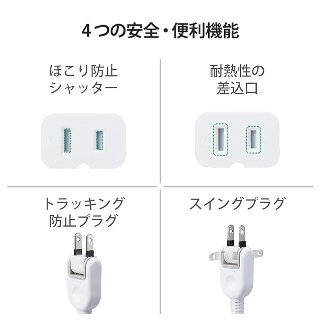 機器のコードがコンセントに届かない場合などに、電源を延長するためのコードです。極性のある2ピン式プラグ・3ピン式プラグでも使用できます。直径10mmの吊り穴を配したシリコン製のタグが付属しており、フックなどに引っ掛けることが可能。トラッキング防止プラグやホコリ防止シャッターで使用時の事故を防ぎ心配なく使えます。 ※3ピン式プラグ使用時、アースは機能しません。