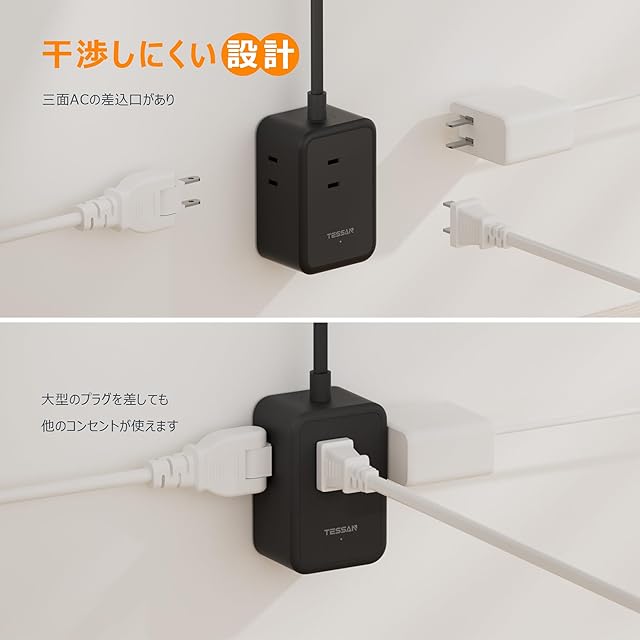 商品名:延長コード 2m 黒 薄型 電源タップ usb コンセントタップ たこあしコンセント テーブルタップ TESSAN 3個AC 1個タイプC 2個タイプA 電源コード type-c タコ足配線 隙間