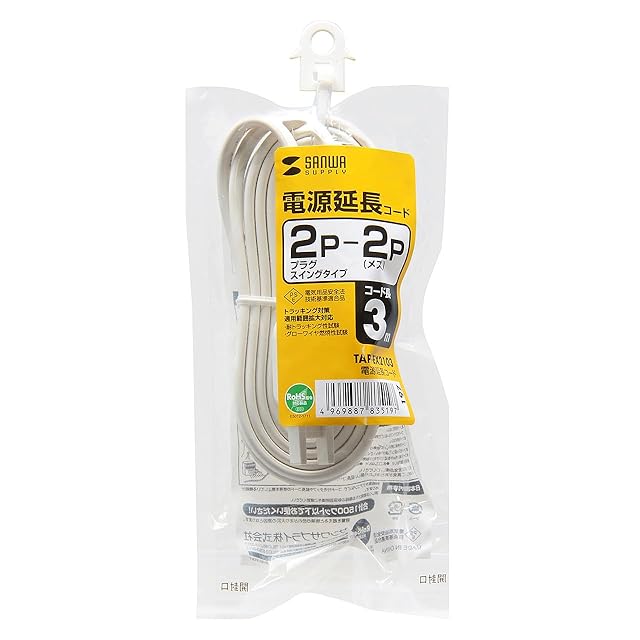 商品名:サンワサプライ 電源延長コード 3m トラッキング火災予防絶縁キャップ付きスイングプラグ TAP-EX2103 ホワイト