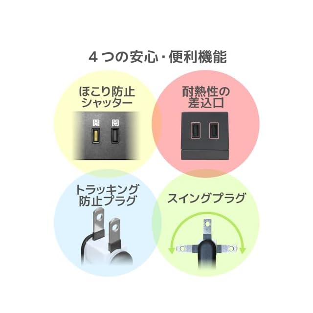 未使用時の差込口へのほこりの浸入を防止するほこり防止シャッターを装備しています。トラッキング現象による火災やお子様のいたずらによる感電・火災の防止に役立ちます。