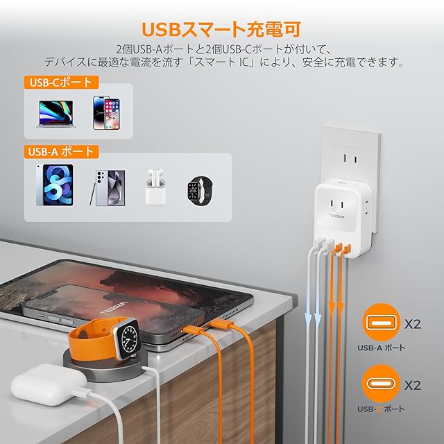 【USB-Cポート付】このusb 電源タップは二つのtype-aポート及び二つのtype-cポートがあります。type-aポート単独で使用する場合、5V-2.4Aの出力になります。type-cポート単独で使用する場合、5V-3Aの出力になります。スマートフォンやタブレットなどの多機種の電子機器への充電ができます。