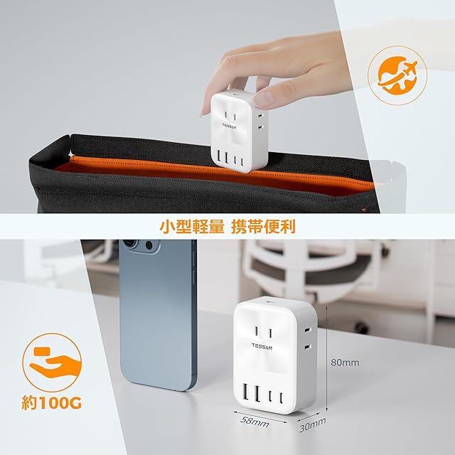 【小型軽量なコーナータップ】サイズは72*55*28mmで、手で握れるぐらい小型で、カバンのスペースを占めません。また、重量は約120gで、軽くて、コンパクトなusb 充電器として自宅だけでなく、旅行や出張などの外出際にもご携帯頂けます。それに、薄いデザインのため、安定性高い壁挿しタップとして、壁のコンセントにしっかり挿入できます。