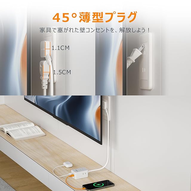 【電源タップ 薄型】薄型プラグの採用により、狭い隙間にも簡単に設置可能です。家具の後ろや壁際でも、スペースを有効に活用できるため、見た目もすっきりします。それに、45°角のデザインを壁のコンセントに差し込んだときに他のコンセントを妨げません。