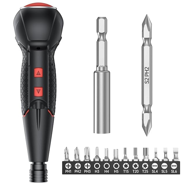 商品名:AAL 電動ドライバー 小型 携帯 手持ち Type-C USB充電式 人間工学設計 滑り止め 軽量 手動兼用 高輝度LEDライト 正逆転切り替え 初心者対応 操作簡単 家庭用 DIY用 合金製 ビット 14本付 2025強化版