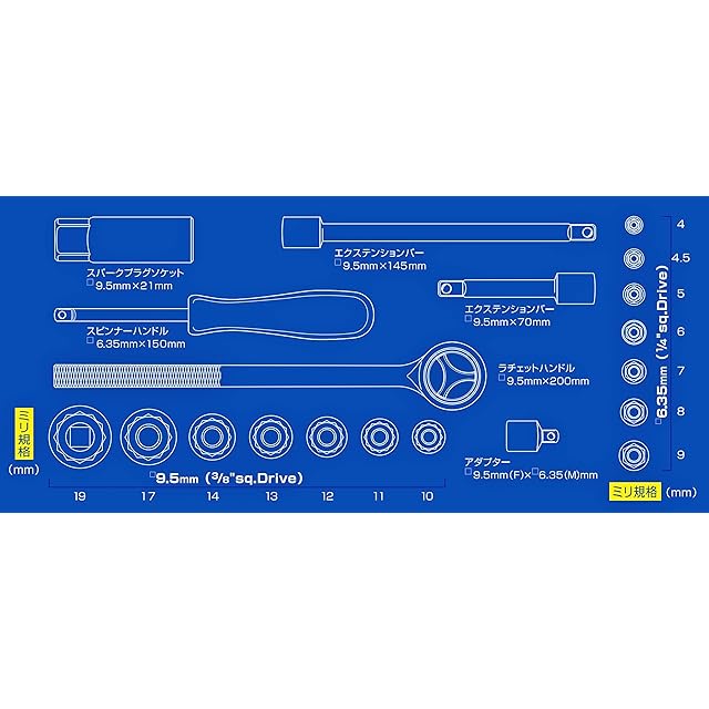 12角ソケット(9.5mm3/8″Sq.Drive)ミリ規格 10, 11, 12, 13, 14, 17, 19mm