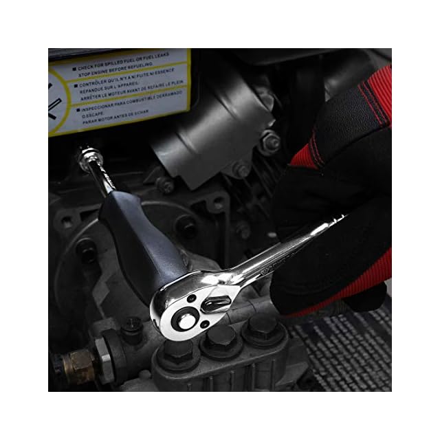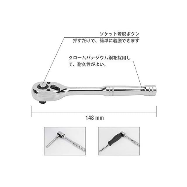 【特徴】ラチェットハンドルはクイックリリースのデザインで、ソケットの脱着はボタンを押すだけで簡単にできる。72山ギアを採用しており、細やかな動きが可能で狭い場所での作業は抜群です。