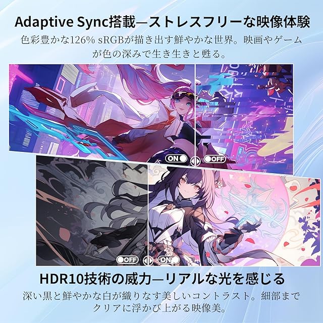 【高度な映像技術】4000:1の高コントラスト比と123% sRGB広色域ボリュームにより、豊かで深みのある色彩表現を実現。Adaptive Sync互換対応で、画面の乱れを完全に抑制します。
