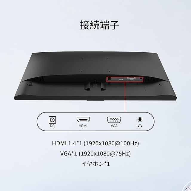 【多様な接続と人間工学設計】HDMI 1.4(1080P@100Hz対応)とVGA(1080P@75Hz対応)を装備し、PCやゲーム機など多様なデバイスに接続可能。VESAマウント対応で、チルト調整機能(-5°~15°±3°)により最適な視野角を簡単に設定できます。