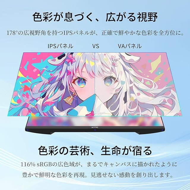 KTC 27インチ WQHD IPS モニター - 高精細映像と快適性の融合 2560×1440のWQHD解像度とsRGB116%広色域ボリュームを備えたIPSパネルで、鮮やかで正確な色彩表現を実現。100Hz高リフレッシュレートとAdaptive Sync技術により、ゲームや動画再生時の滑らかな表示が可能です。目に優しいフリッカーフリー設計とブルーライト軽減機能で、長時間の作業やゲームプレイでも快適。HDMI/DP接続に対応し、PCやゲーム機などマルチデバイス接続が可能。3年間の付きで安心してお使いいただけます。