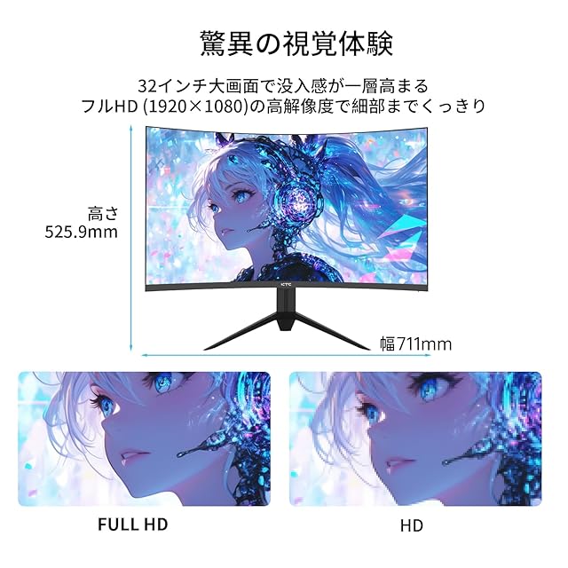 【没入感抜群の1500R湾曲大画面】32インチの大画面と1500Rの深い湾曲率が視野を包み込み、ゲームや映画に深い没入感をもたらします。VAパネルと**178°/178°の広視野角**により、どこから見ても色褪せない**3000:1の高コントラスト比**を実現し、深い黒と鮮やかな色表現で美しい映像を楽しめます。