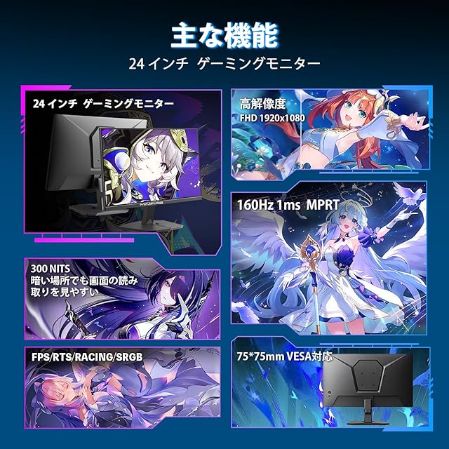 [リフレッシュレート] 160Hz、[応答速度] MPRT 1ms、[傾斜角度調整] 前後(-5°から15°+/-2°)、178°広視野、アイケア、ブルーライト軽減、フリッカーフリー、Adaptive Sync 、ゲームプレイアシス VESA対応(75mm x75mm)。