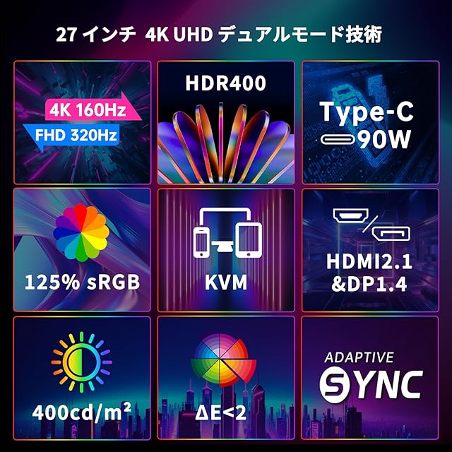 商品名:KTC 27インチ 4K UHDゲーミングモニター FAST IPS 3840x2160@160Hz /1920*1080@320Hzデュアルモード 1ms HDR400対応 sRGB125%色域ボリューム 400cd/m² DC調光 HDMI2.1*2 DP1.4*1 90W Type-C*1 USB3.0 チルト・回転・昇降可能で簡単設置 VESA対応 三年付き H27P6