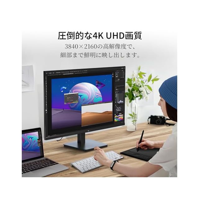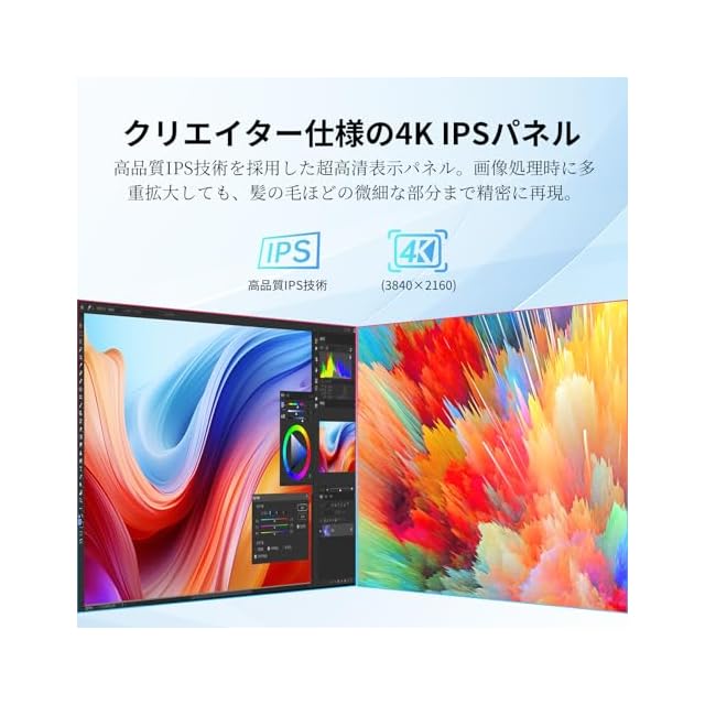 【4K IPSパネル】 IPS技術を採用した4K超高清パネル(3840×2160)で、163 PPIの高精細表示を実現。画像編集やマルチタスク時も、髪の毛一本レベルまでクリアに再現。