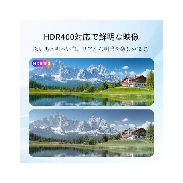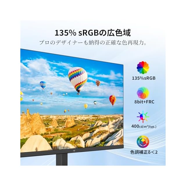 【HDR400 & 広色域カバー】HDR400対応で明暗の差が鮮明、sRGB135% Adobe RGB 107%、DCI-P3 100%の色域ボリューム、1.07B colors (8-bit + Hi-FRC)、1000:1コントラスト比と400cd/m²の高輝度で色彩豊かな画面表現。