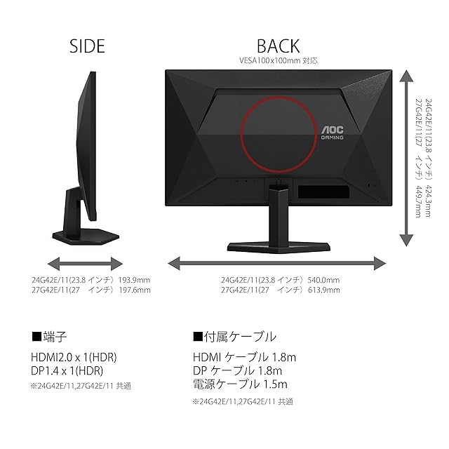 商品名:AOC ゲーミングモニター 24G42E/11, 23.8インチ, フルHD/1920×1080@180Hz, 応答速度0.5ms(MPRT), Fast IPS, HDMI2.0 x 1/ DP1.4x1,ブルーライト低減, フリッカーフリー, Adaptive Sync, HDR10対応, 3年