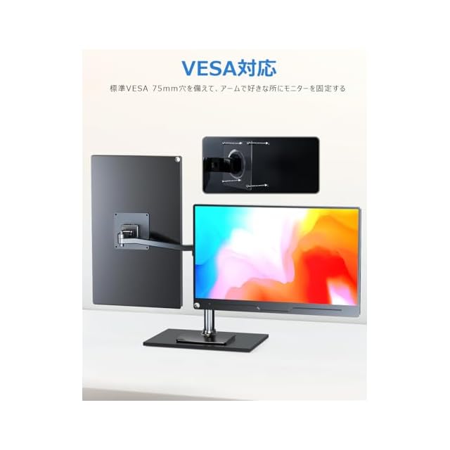 【保護カバー付&VESA対応】滑り止め材料の保護カバーはモバイルモニター本体をホコリや傷から守りともに、折りたたむことでスタンドとしても使用できます。標準VESA 75ネジ穴でモニターを壁かけブラケット、アーム式ブラケットに取り付けられます。小さいスペースでも最善な配置が見つかります。ご注意:①メニューボタンを押して、モニターの設置に入り、輝度、画像調節、色設定、OSD設定、リセット、その他を設定できます。②該当商品はバッテリー内蔵しておりません。充電することができません。