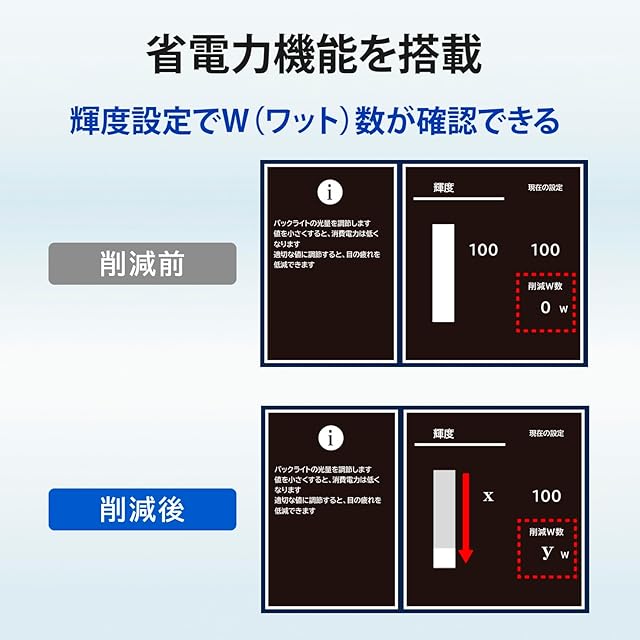 【省電力機能を搭載】削減したいW(ワット)数を確認して、「輝度」を設定することができます。どれくらい電力を削減して使うのか、数値目標を立てる場合にとても便利な機能です。