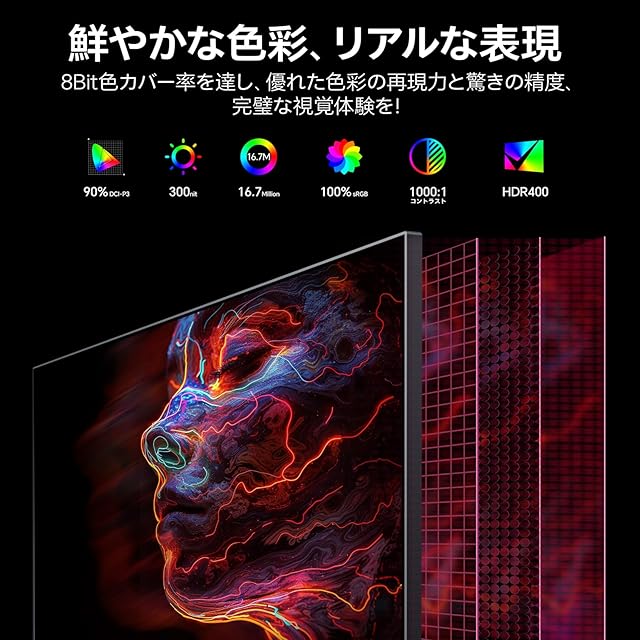 広色域:178°視野角のFast IPSパネルを採用、90%DCI-P3色カバー率 と 100%sRGB高色域、鮮やな映像を映し出す。300cd/m2の輝度で8Bit·約1677万色表示、1000:1コントラスト比の25インチモニター
