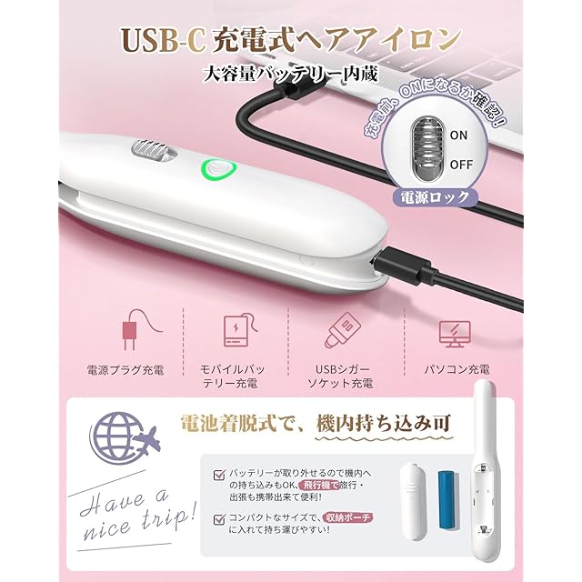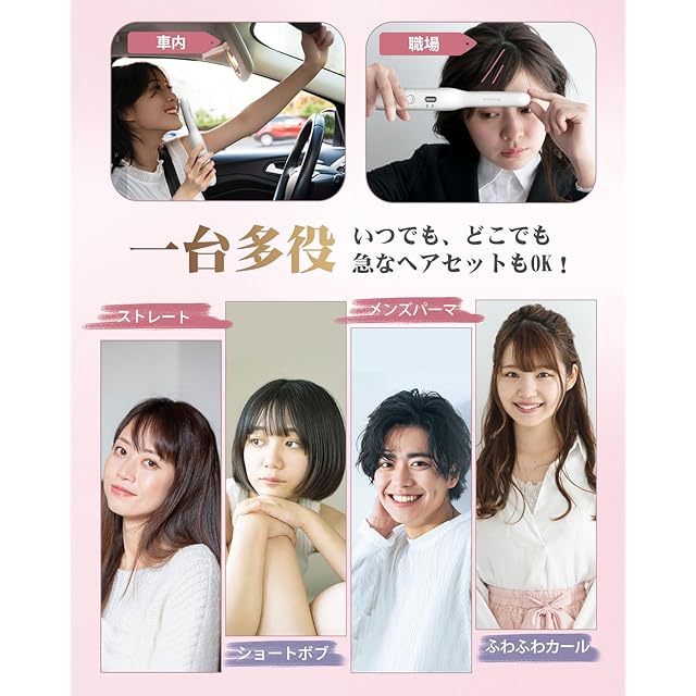 【旅行・デート・職場の身だしなみ管理に役立つ】充電式ヘアアイロンは主に外出先への持ち運び用として使用されるアイテムです。場所を問わず、身だしなみ管理に役立ちます。くせ毛を伸ばしたり、前髪などの手直したり、使いやすいです。特に梅雨の時期は雨が多くて髪がみだれやすい方にオススメです。