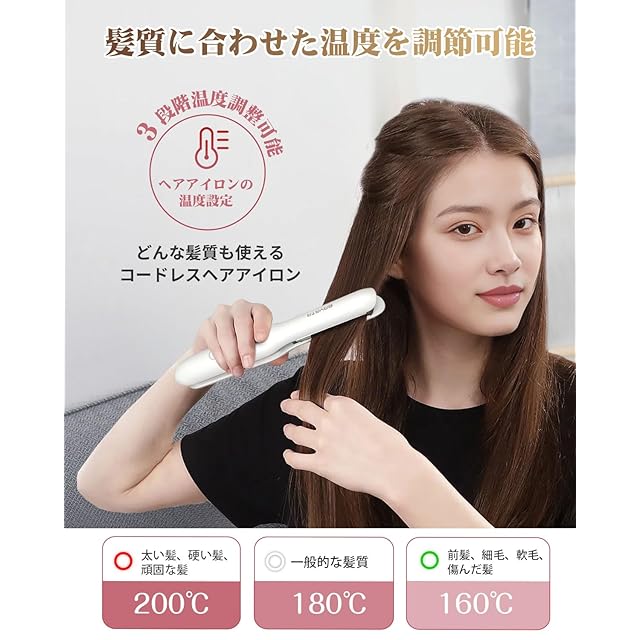 【急速加熱&160℃~200℃三段階温度調節】ストレートアイロンのプレート中ダブルヒーターを搭載したので、電源を入れてすぐに温かくなります。忙しい朝にも大変助かるものとなっています。また、3段階温度(160℃~200℃)調節機能がついてるのも便利で、細い髪にも、硬い髪にも合わせて温度調整が可能です。誰でもどこでもスムーズにヘアセットができ、隙間時間を活用してパッと髪を直せます。