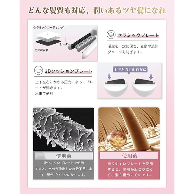 【保温性が高いセラミックコーティング&ヘアに優しいクッションプレート】このヘアストレートナーは温まりやすく冷めにくいセラミックのプレートを採用します。さらに、動かす方向や挟む髪の量に合わせて上下する3Dクッションプレートは髪に対して均一に力を入れられます。ヘアアイロンを使うとき、摩擦が起こりにくく、髪も傷めにくいです。