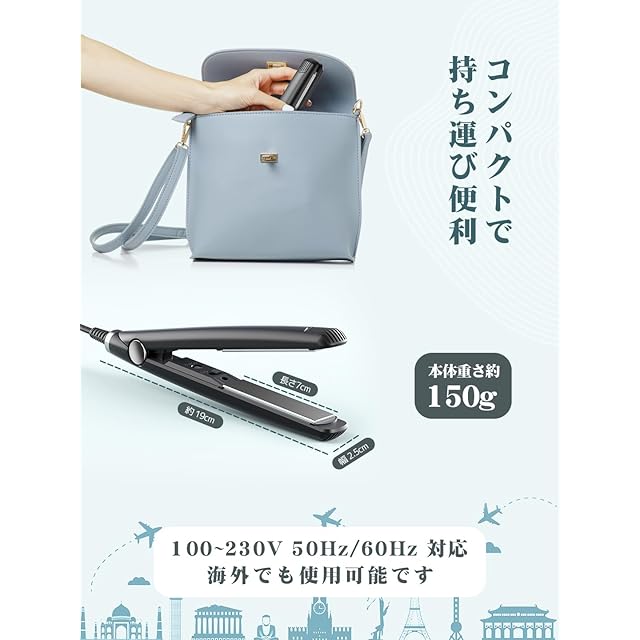 【わずか150ℊで持ち運びが便利】巻き髪アイロンはコンパクトで軽量なデザインで、いつでもどこでもスタイリングが可能です。100~220V海外対応で、旅行や外出先でも変圧器なしでご利用いただけます。