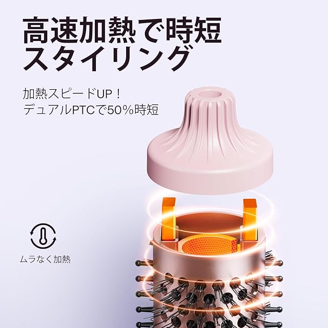 【時短スタイリング】デュアルPTCヒーター搭載で立ち上がりが早く、忙しい朝にもすぐ使える設計。時短スタイリングを可能にし、通常のブローやヘアアイロンでは出せない、ツヤのある美しいカールで柔らかな質感に。最後のボタン操作から、約1時間後に自動的に電源OFFになる安全設計