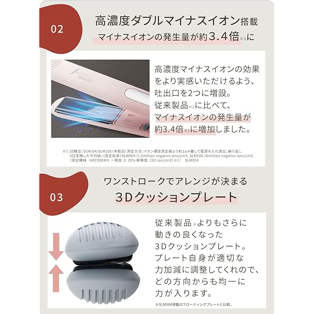 リーズナブルなのに高品質を実現した ストレート ヘアアイロン。ヘアアイロン “本体”に全精力を注ぎました プロ仕様 サロンクオリティを実現 。・従来製品*の約2倍の高濃度ダブルマイナスイオンで、うるツヤ スタイリング を実現。・従来製品の約2.14倍なめらかなミラー チタニウムプレート で面白いほど髪にツヤを与えます。 ・縮毛矯正でも使われるMAX230℃のパワフルなヒーターを搭載。80℃~230℃まで5℃間隔31段階で温度設定ができるから髪質に合わせたスタイリングが可能になりました! ・なめらかなプレート はスタイリング時の髪へのダメージを抑えます。 ・ マイナスイオンを強力噴射する強化版 高濃度ダブルマイナスイオン発生装置を搭載。 キューティクルを保護し、さら艶ストレートを実現 。・3Dクッションプレート は 上下左右にクッション性のあるフローティングプレートを採用し、ストレートだけでなく、様々なアレンジにも対応ができるようになりました。 ストレートにも沈み込むクッションプレートでむらなく圧力をかける事ができるので摩擦を抑え、髪へのダメージを抑えることができ、綺麗なスタイルに仕上がります。また、髪を挟む力が強いので1回で簡単にストレートヘアが完成します。ロングヘア、ボブ、ショートカット、前髪用 どんなスタイルにも◎。カールもストレートもできる2WAYタイプです。弊社の委託工場はアメリカ、ヨーロッパ、日本国内の一流ブランドを製造する工場で製造しております。 SALONMOONは信頼できる品質の商品をできるだけリーズナブルに提供しております。