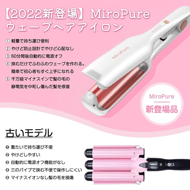 商品名:MiroPure ヘアアイロン カール ウェーブアイロン 26㎜ 挟むだけで可愛い カールアイロン 実現 160℃~220℃ 千万級マイナスイオン吹出 やけど防止 初心者向けカールアイロン プレゼントも最適 海外対応 PSE認証済 日本語取扱説明書付き ホワイト