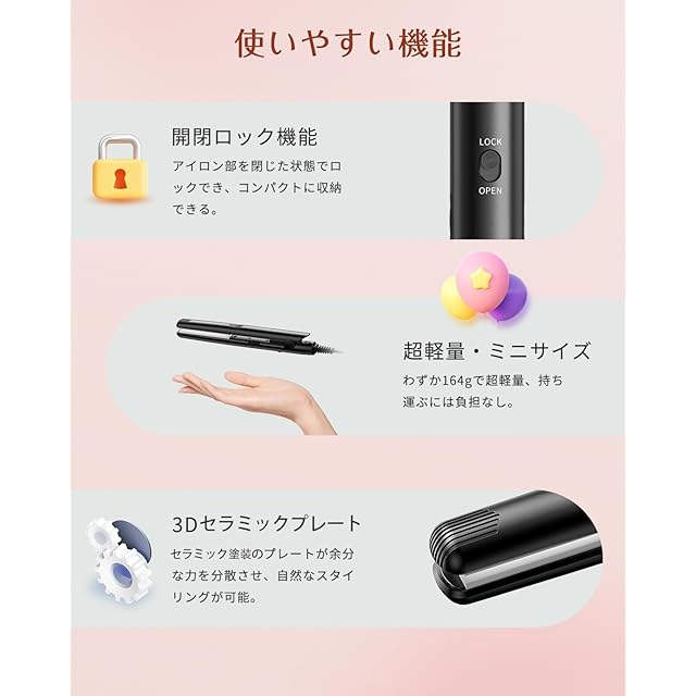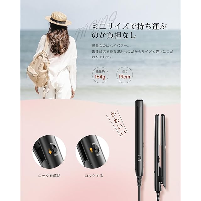 【ミニデザイン&ロック機能】:本体わずか150gの重量、19CMのコンパクトサイズを実現し、市販品より軽くて持ち運びやすい。自宅だけでなく、出張や旅行の際にもスタイリングを楽しめます。また、使用しない場合は安全性のため、開閉ロックも付いてて更に収納便利になります。