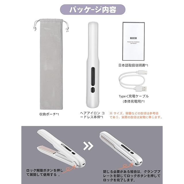 商品名:コードレス ヘアアイロン 2WAY 18mmプレート カール&ストレートコードレスアイロン 140℃~200℃ 4段階温度設定可能 30s 急速加熱 20分自動電源OFF 誤起動防止ロック Type-C 充電式ヘアアイロン 男女兼用 ミニ 小型 軽量 持ち運び便利 家庭/出張/通勤/旅行用 (ホワイト)