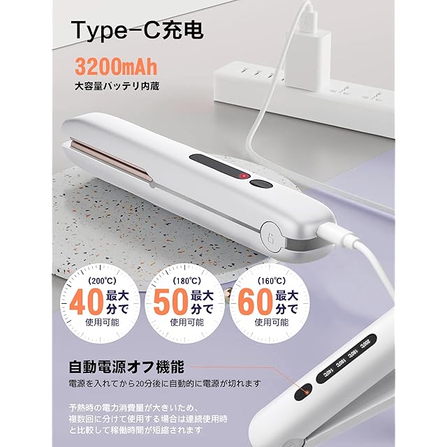 【コードレス&どこでも使える便利さ】コードレス設計、コンセントの位置の不便さを気にする必要がありません。 3200mAh大容量バッテリー内蔵。 40~60分間連続使用可能。場所を選ばずに使えるのが魅力。カフェでの作業前、旅行先のホテル、車の中など、いつでもどこでもサッと前髪や毛先のセットが可能。軽量・コンパクトでバッグにもすっきり収まり、持ち歩きも快適です。