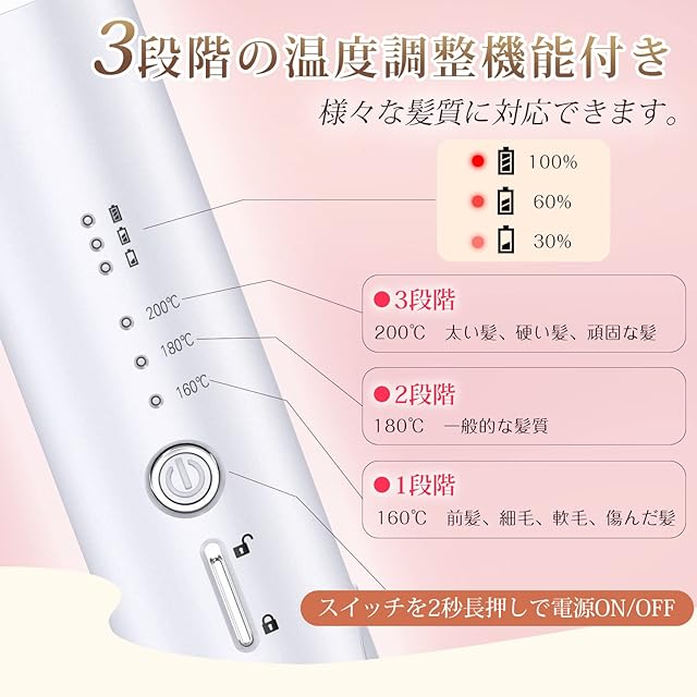 商品名:ヘアアイロン コードレス ストレート ミニ ヘアアイロン usb充電式 2way カール&ストレート 3段階温度設定可能 ワイヤレス 前髪 軽量 カバー付き 日本語説明書付き (ホワイト) (ホワイト)