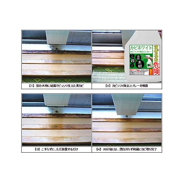 <実際のカビ取り方法について>●木材のカビにまんべんなくスプレーしてください。事前に濡らしたり拭きそうじも不要です。カビの胞子が飛び散り他のところまでカビが生える原因になるので薬剤を直接スプレーしてください。ビショビショになるほどかけると塩素臭が消えにくくなるのでざっと湿る程度で十分に効果があります。スプレーしたら30分放置してください。まだカビが残っていたらその部分だけもう一度スプレーして30分放置してください。30年物のカビでもこの作業を2~4回程度繰り返せば徐々に取れて行きます。カビが消えたらざっと水拭きして乾燥させてください。
