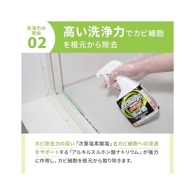 【長時間放置すれば効果アップ】洗剤のカビに留まる時間を長くするほど、カビへの洗剤の浸透性が高まり、除去性能がアップします。 例えば就寝前にカビ取り剤を吹き付け、起床後洗い流すと、驚くほどの効果があります。 ※素材への損傷を事前にお確かめの上、ご使用ください。