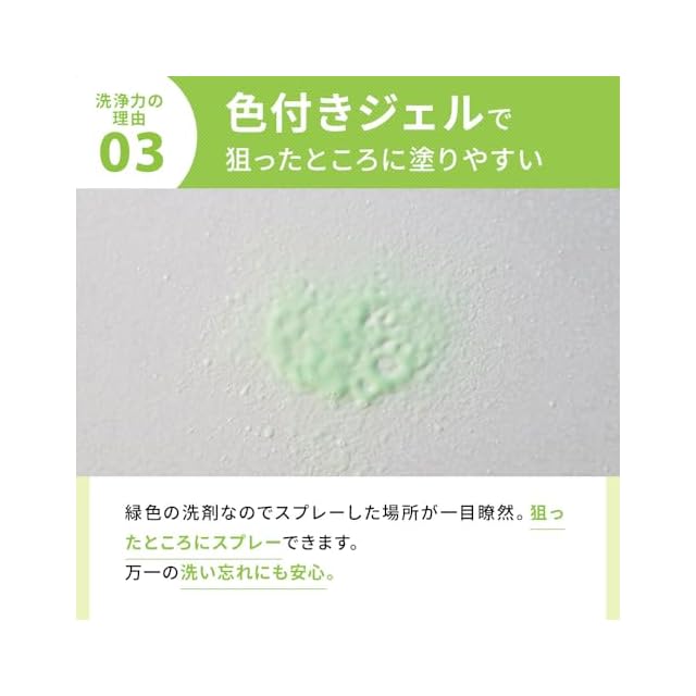【スプレーした場所がすぐに分かる】黄緑色の洗剤なので、スプレーした場所がすぐに分かり、万一の洗い忘れにも安心です。